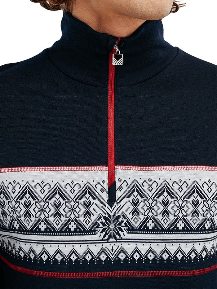 Der Dale of Norway Moritz Masculine Superfine Sweater bietet durch die extra weichen Wollfasern (16,5 Mikron) luxuriösen Tragekomfort und ist selbst bei sehr empfindlicher Haut zuverlässig kratzfrei. Er kann entweder als dünner Merinopullover im Alltag oder als warme Skiunterwäsche im Schichtenaufbau getragen werden. Das klassische Norweger Design umspannt die Brust und verleiht dem leichten Skipullover einen typisch skandinavischen Look. Der Reißverschluss ist hinterlegt, was den Einsatz als First Layer direkt auf der Haut ermöglicht.