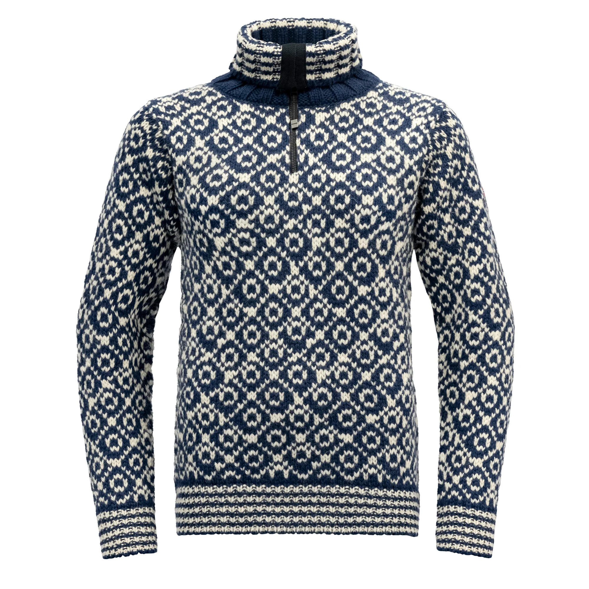 Dieser original Norweger Pullover mit seinem bis zur Nase hoch abschließenden Zip-Kragen schützt vor eisiger Kälte und ist aus 100% Wolle von norwegischen Schafen gestrickt. Der Devold Svalbard Zip Neck ist ein Klassiker und ein Bindeglied zwischen traditionellem Design und einem modernen Schnitt. Durch die hohe Elastizität der Wolle passt sich der warme Strickpullover fast jeder Figur an und kann auch aufgrund des zeitlosen Design sowohl von Männern, als auch von Frauen getragen werden. Hergestellt wurde der Devold Pullover im firmeneigenen Werk in Litauen (EU-Standards).