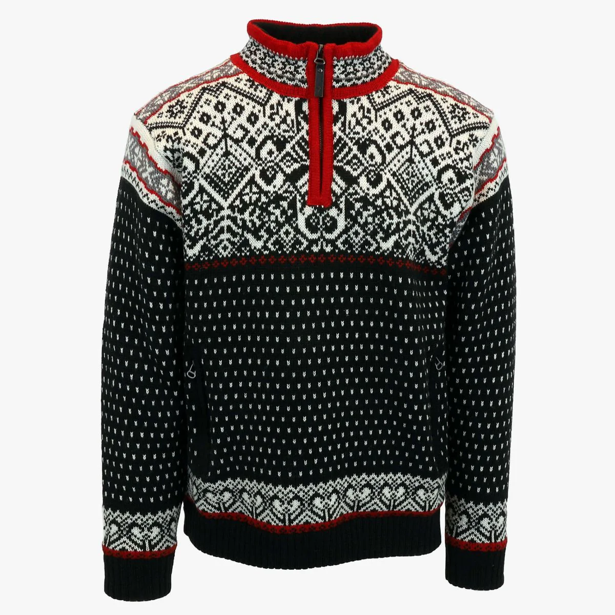 Der Norweger Pullover Björn mit Windbreaker Funktion bietet einen einzigartigen und umwerfenden Skandinavien-Look für den aktiven Outdoor-Typ. Der winddichte Ski Pullover ist aus einer außerordentlich warmen Wolle ( 3-lagige Kammgarnwolle ) gestrickt. Auch an einem stürmischen Tag bleibt er genauso warm, denn durch das Futter aus Wind Cutter K-100 ist dieser Norweger Pulli nahezu vollständig winddicht. Dieses Windstopper-Gewebe ist zudem wasserabweisend und atmungsaktiv, d.h. körpereigene Feuchtigkeit wird abgeleitet, ohne dass Nässe von außen eindringt. Ein hoher Kragen schützt Hals und Nacken vor dem Wind und setzt durch seinen kräftig roten Rand auch modische Akzente. Ein ¼ -Reißverschluss lässt sich vorn öffnen um frische Luft einzulassen oder Platz für einen warmen Schal zu schaffen. Der starke Kontrast zwischen den Farben Schwarz, Weiß und Rot in einem gepunkteten und geometrischen Muster sorgt für einen modischen Outdoor Look.