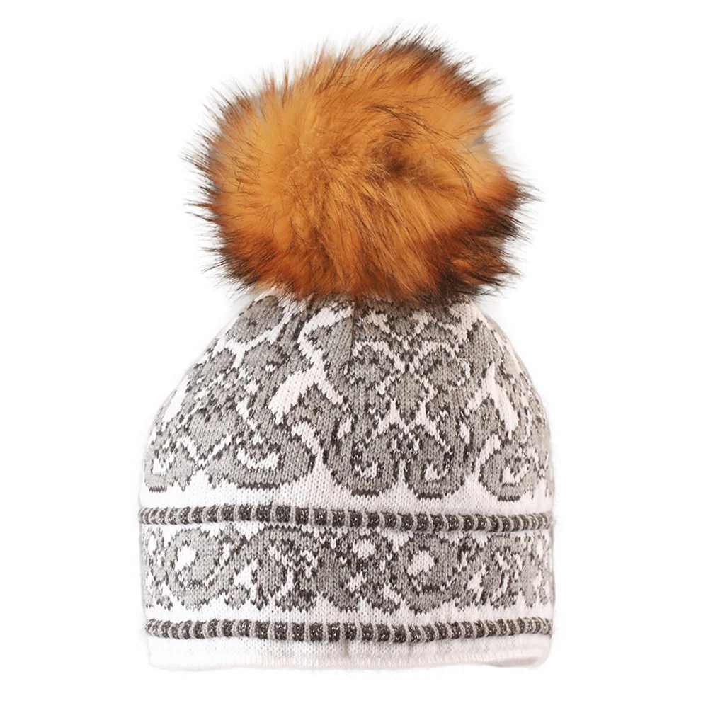 Extravagante Wollmütze für Damen mit orientalischem Muster und goldenen bzw. silbernen Akzenten. Eine warme Strickmütze mit Kunstfellbommel und weichem Fleecebesatz innen. Ein edles Accessoire nicht nur zum Skifahren.